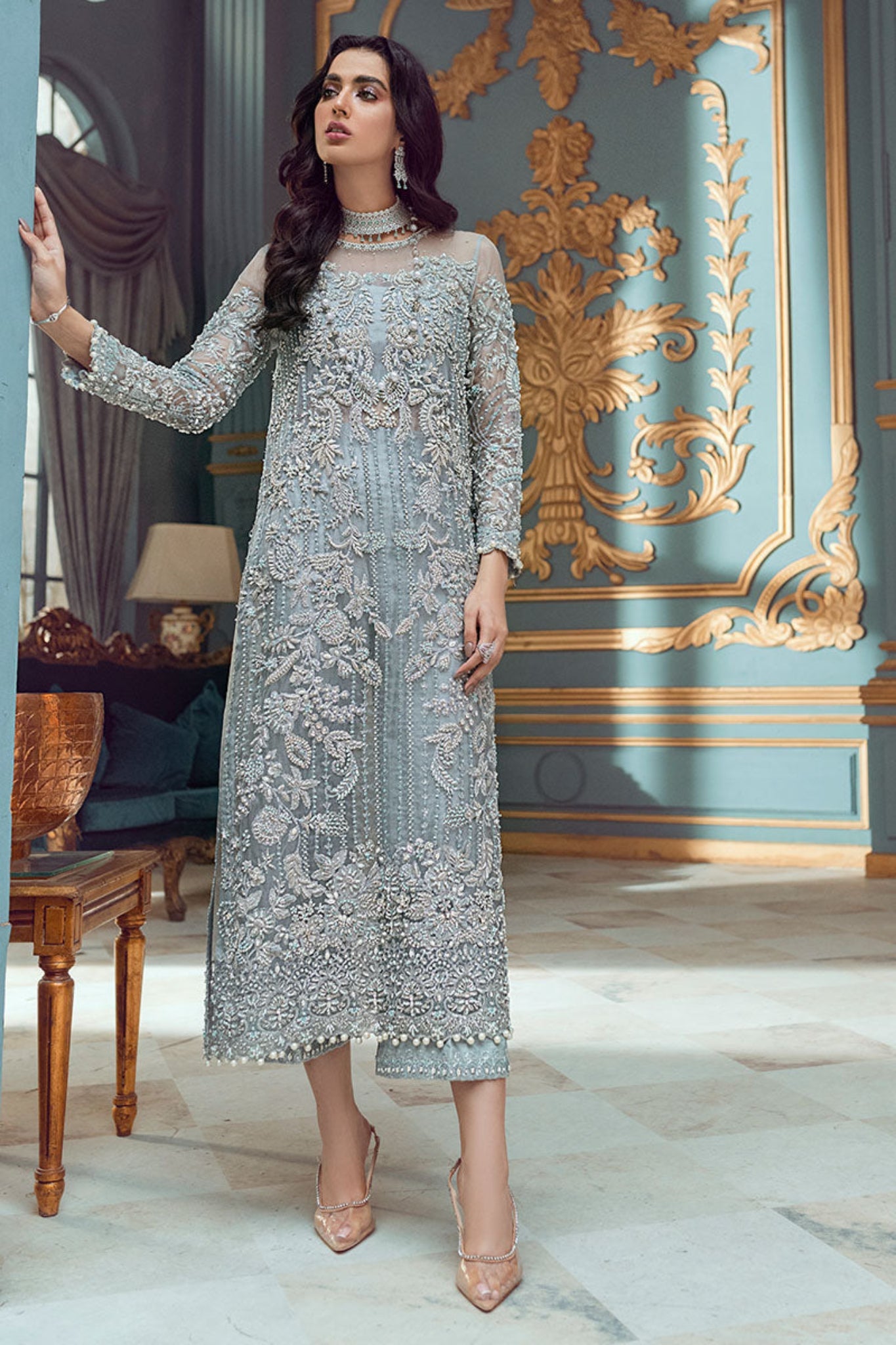 This Olive shade long shirt crafted from pure silk organza is heavily ornamented with Crystal's and thread work. This luxurious outfit is finished and a pearl embellished dupatta for an ethereal look.