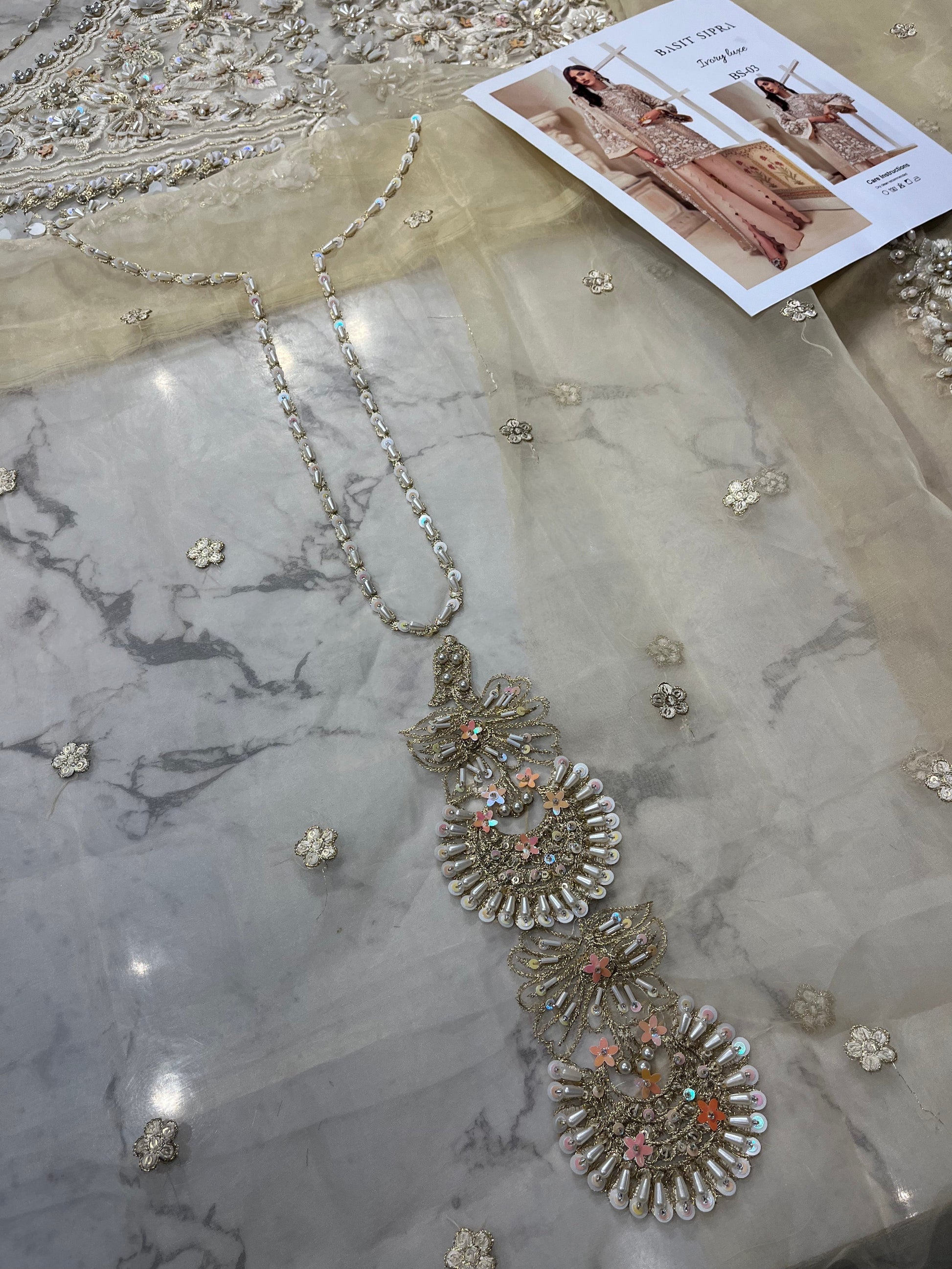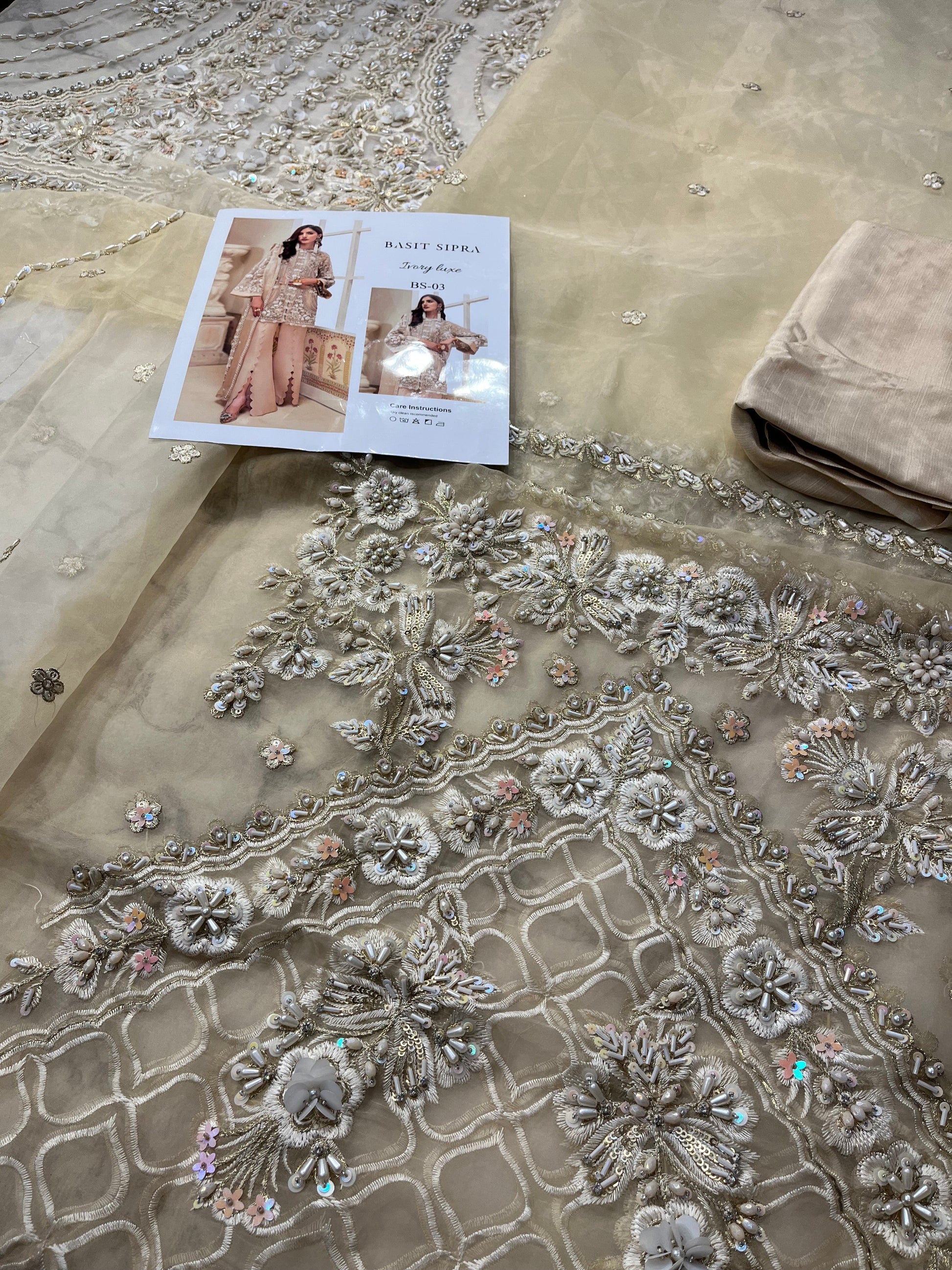 Description: Pure organza shirt with signature embroidered work having intricated hand embellishments along 3d work. Rsilk fused scalped pants, Net organza dupatta with hand embellished work.